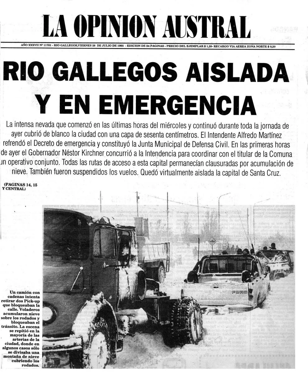 El 27 de julio de 1995, Rio Gallegos, la capital de Santa Cruz amanecía cubierta por un espeso manto de nieve que, en algunos lugares, superaba el metro de altura. Hasta hoy en Río Gallegos es recordada como “La nevada del siglo”.
