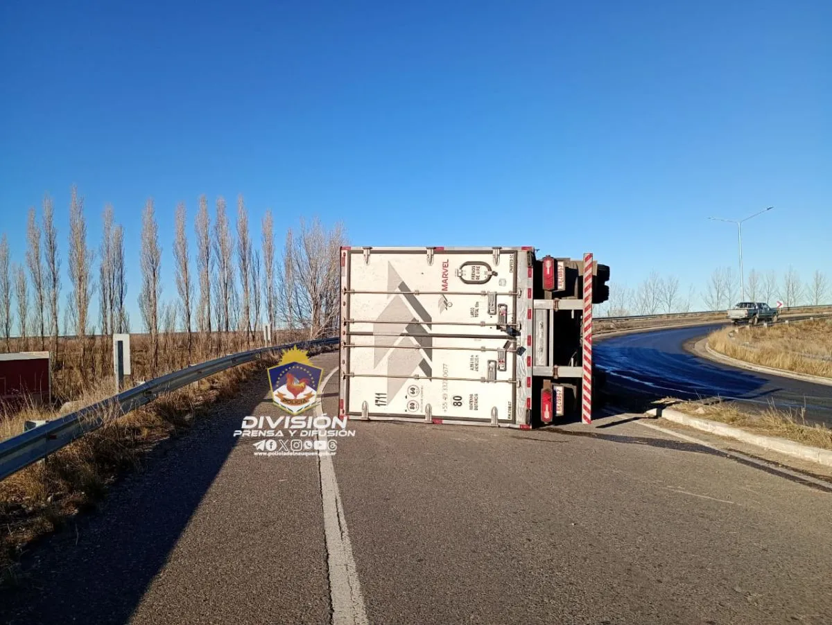Plottier.- Un nuevo accidente de tránsito sacudió las rutas neuquinas. En la mañana de este sábado, un camión proveniente de Chile con destino a Brasil protagonizó un vuelco en el derivador de Autovía Norte, a la altura de Plottier.