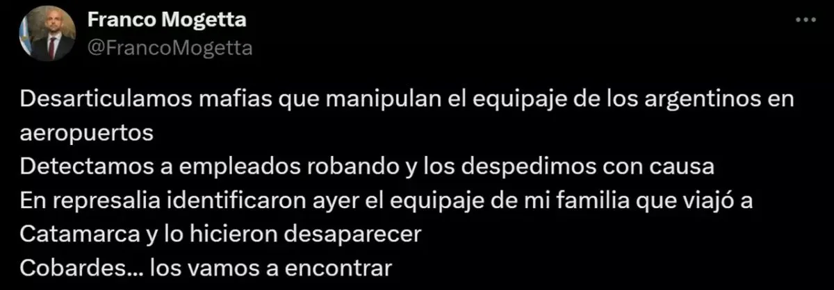 A través de sus redes sociales, Mogetta expresó su indignación y acusó a los responsables de ser "cobardes". "Desarticulamos mafias que manipulan el equipaje de los argentinos en aeropuertos. En represalia, identificaron ayer el equipaje de mi familia y lo hicieron desaparecer", denunció el funcionario.