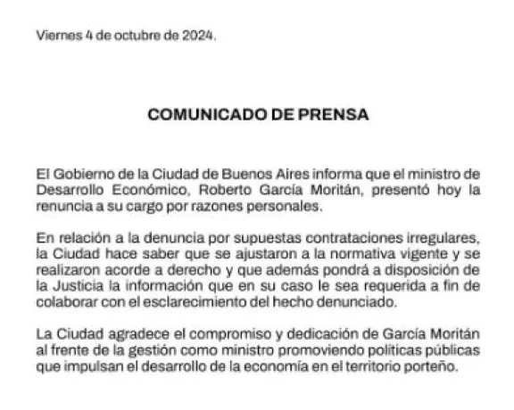“Gracias, Roberto García Moritán, por tu gestión al frente del Ministerio de Desarrollo Económico”, escribió en X Jorge Macri, y agregó: “Lamento que des un paso al costado, pero entiendo que tu prioridad es proteger a tu familia”.
