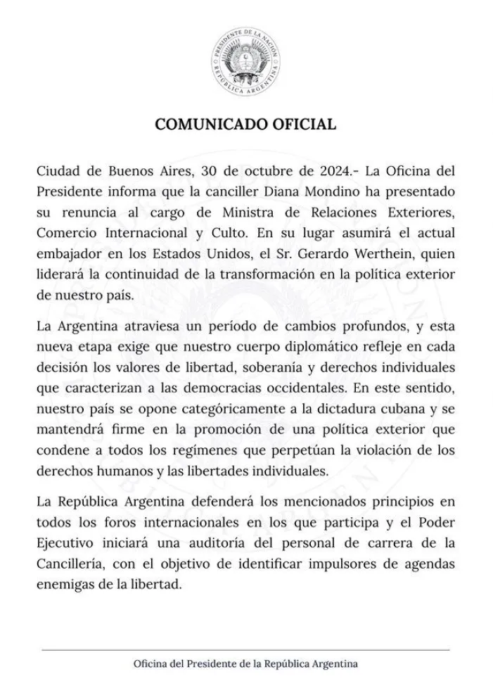 El presidente Javier Milei solicitó este miércoles la renuncia de la canciller Diana Mondino, luego de que Argentina votara en la Asamblea General de las Naciones Unidas en contra del bloqueo de Estados Unidos a Cuba.