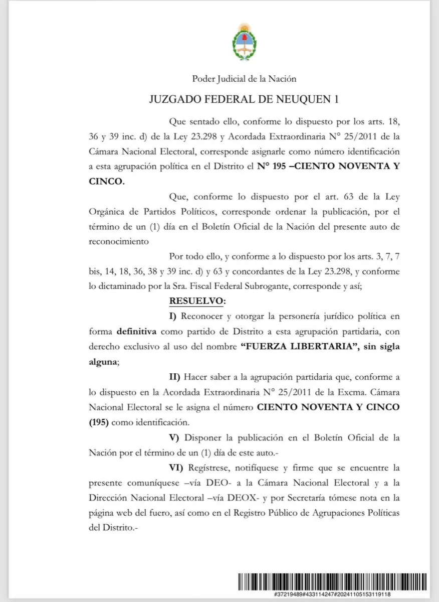 El empresario y dirigente liberal Carlos Eguia confirmó su agrupación Fuerza Libertaria , un nuevo partido con reconocimiento de la justicia con personería jurídica política para competir en las elecciones de 2025 en el distrito Neuquén.