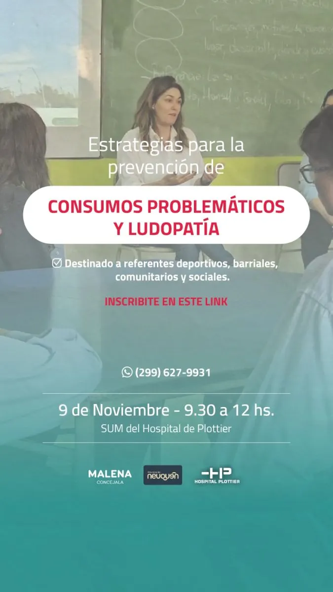 Este sábado 9 de noviembre, el Hospital de Plottier será sede de la charla "Estrategias para la prevención de consumos problemáticos y ludopatía", un evento pensado para fortalecer la prevención y brindar herramientas a referentes comunitarios, deportivos, sociales y educativos.