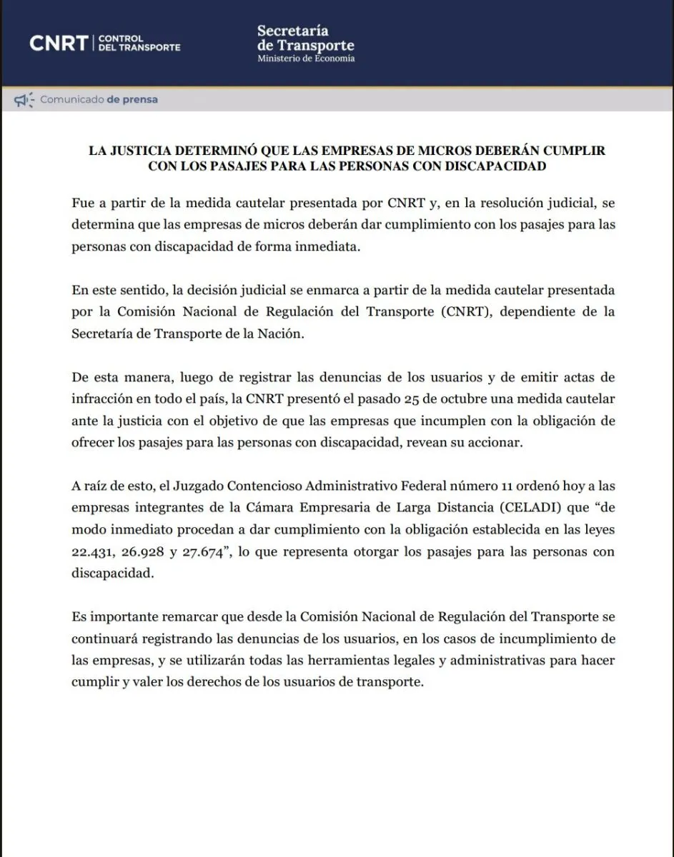 El fallo responde a denuncias realizadas por pasajeros con discapacidad que se enfrentaron trabas para obtener los pasajes establecidos por la Ley N.º 22.431 y la Ley N.º 25.635 , que estipulan la gratuidad de estos boletos como parte de un esquema de inclusión social.