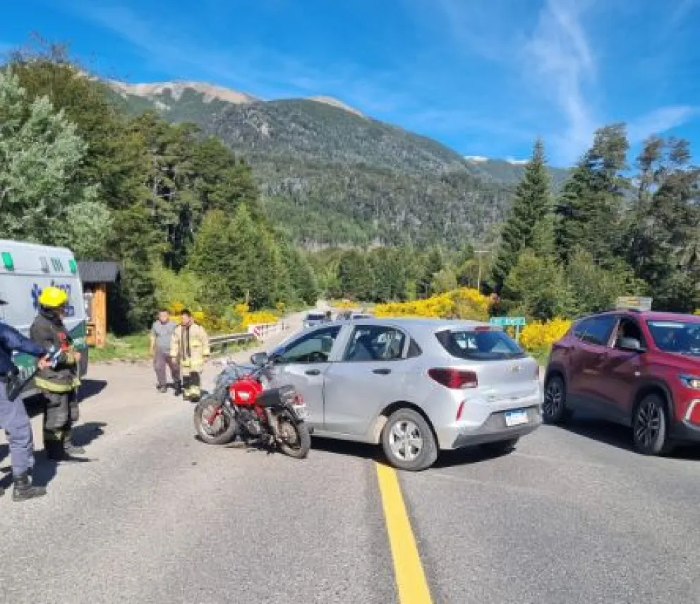 Neuquén.- Este lunes a las 17:40 horas, Bomberos Voluntarios de Villa La Angostura recibieron un llamado alertando sobre un choque lateral entre un automóvil y una motocicleta en el kilómetro 2110 de la Ruta 40, cerca del Puente Bonito.