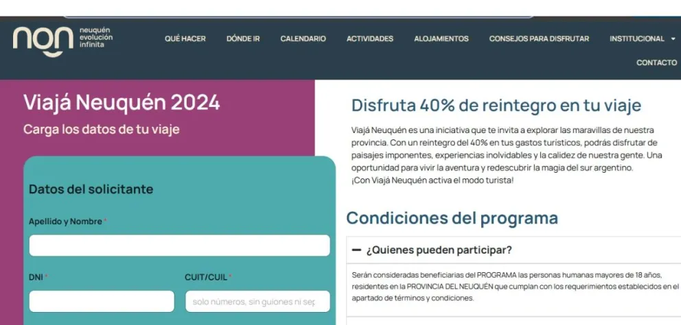 La página para el programa Viajá Neuquén