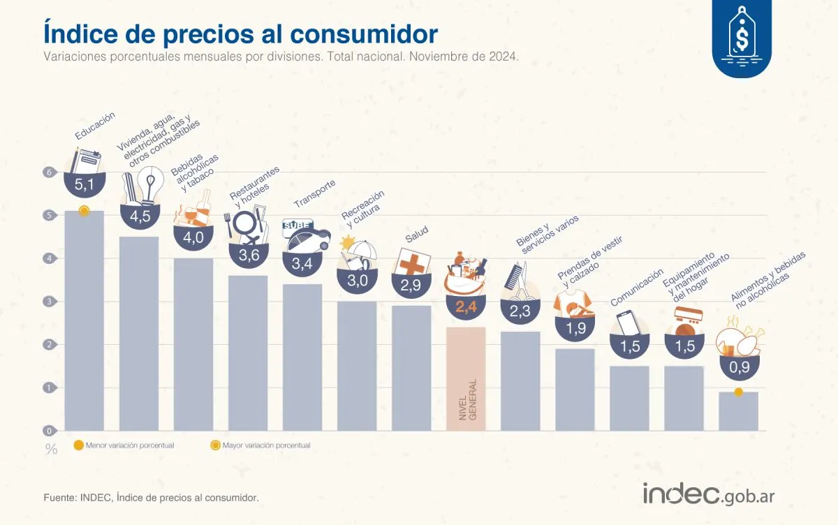 Los rubros que más se incrementaron en noviembre de 2024 fue Educación (5,1%), escoltada por Vivienda, agua, electricidad, gas y otros combustibles (4,5%)