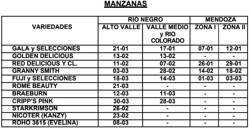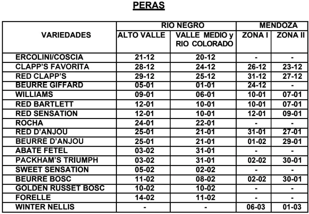 La propuesta detalla las fechas estimadas de cosecha para las principales variedades de peras, como Ercolini, Williams, Red Bartlett y Packham's Triumph, y para las manzanas, entre ellas Gala, Red Delicious, Granny Smith y Fuji. Los plazos abarcan diferentes zonas productivas, como Alto Valle y Valle Medio en Río Negro, así como las Zonas I y II de Mendoza.