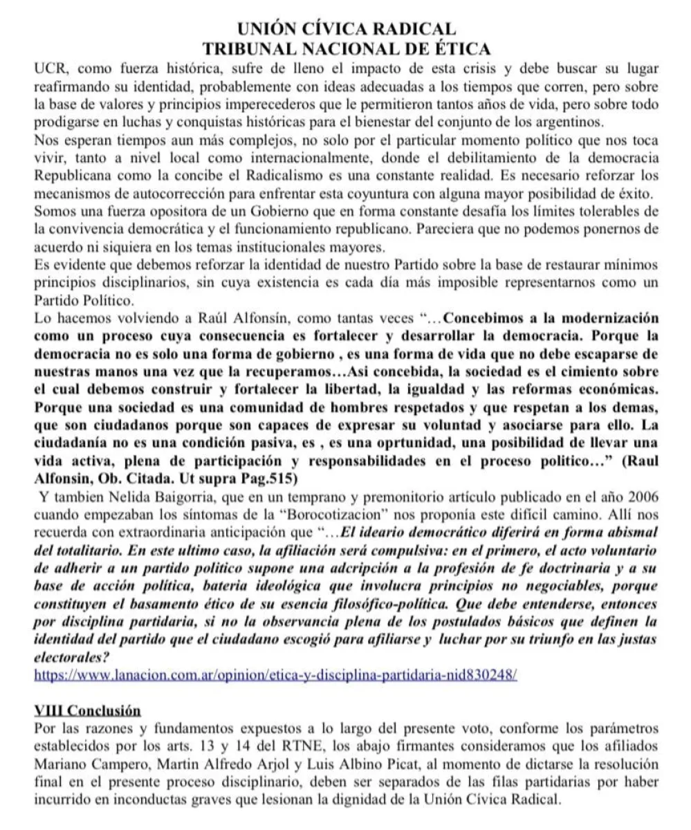 El fallo, fundamentado en los artículos 13 y 14 del reglamento del Tribunal Nacional de Ética (TNE) y el artículo 53 de la Carta Orgánica Partidaria, argumenta que los tres legisladores expulsados incurrieron en una "grave conducta partidaria que afecta la dignidad de la UCR". La resolución se adoptó con mayoría en el tribunal, aunque hubo un voto en disidencia.