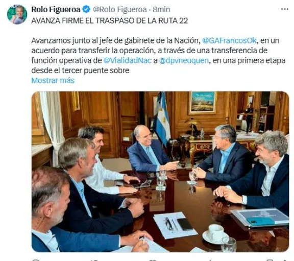 El gobernador de Neuquén, Rolando Figueroa, anunció a través de su cuenta de X que se concretó un acuerdo con el jefe de Gabinete de la Nación, Guillermo Francos, para transferir la gestión operativa de un tramo estratégico de la Ruta Nacional 22 a la Dirección Provincial de Vialidad de Neuquén.