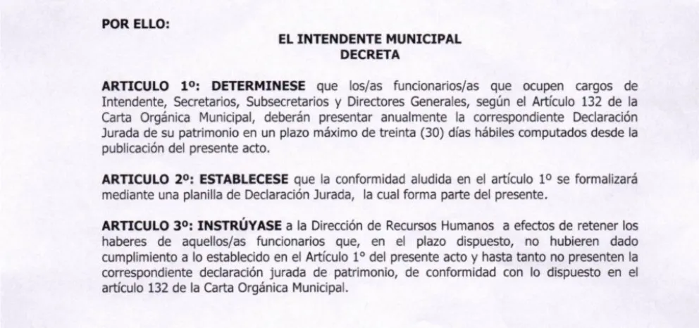 Además, el Decreto firmado por el intendente Saloniti “instruye a la Dirección de Recursos Humanos a efectos de retener los haberes de aquellos/as funcionarios que, en el plazo dispuesto, no hubieren dado cumplimiento a lo establecido y hasta tanto no presenten la correspondiente Declaración Jurada de patrimonio”.