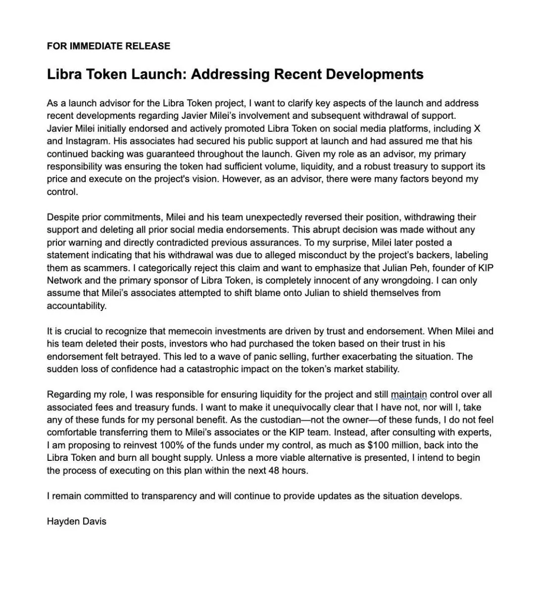 Davis también explicó que su rol en el proyecto era garantizar la liquidez del token y aseguró que no utilizó ni utilizará fondos del proyecto para beneficio personal. "Quiero dejar inequívocamente claro que no he utilizado, ni utilizaré, estos fondos para mi beneficio personal", sostuvo.