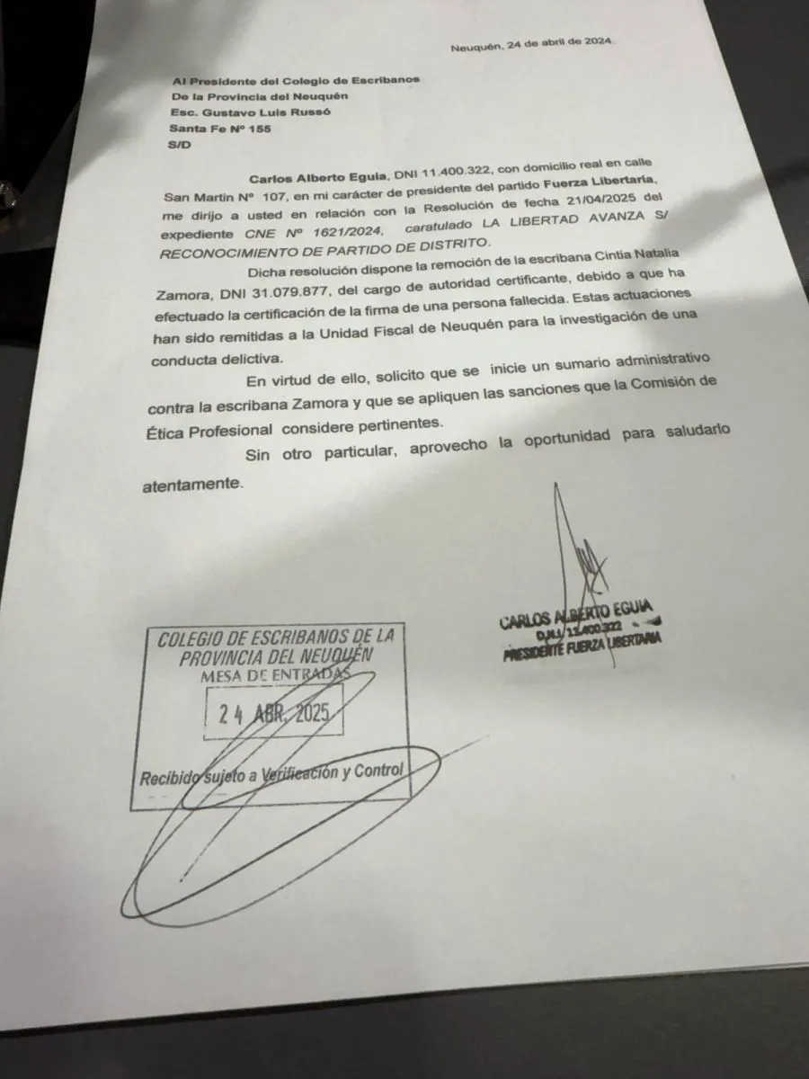 El presidente de Fuerza Libertaria, Carlos Eguía, presentó una denuncia formal contra la escribana Cintia Zamora, actual directora del PAMI en San Martín de los Andes. La acusación se centra en su rol como certificadora de documentos presuntamente vinculados a una persona fallecida.
