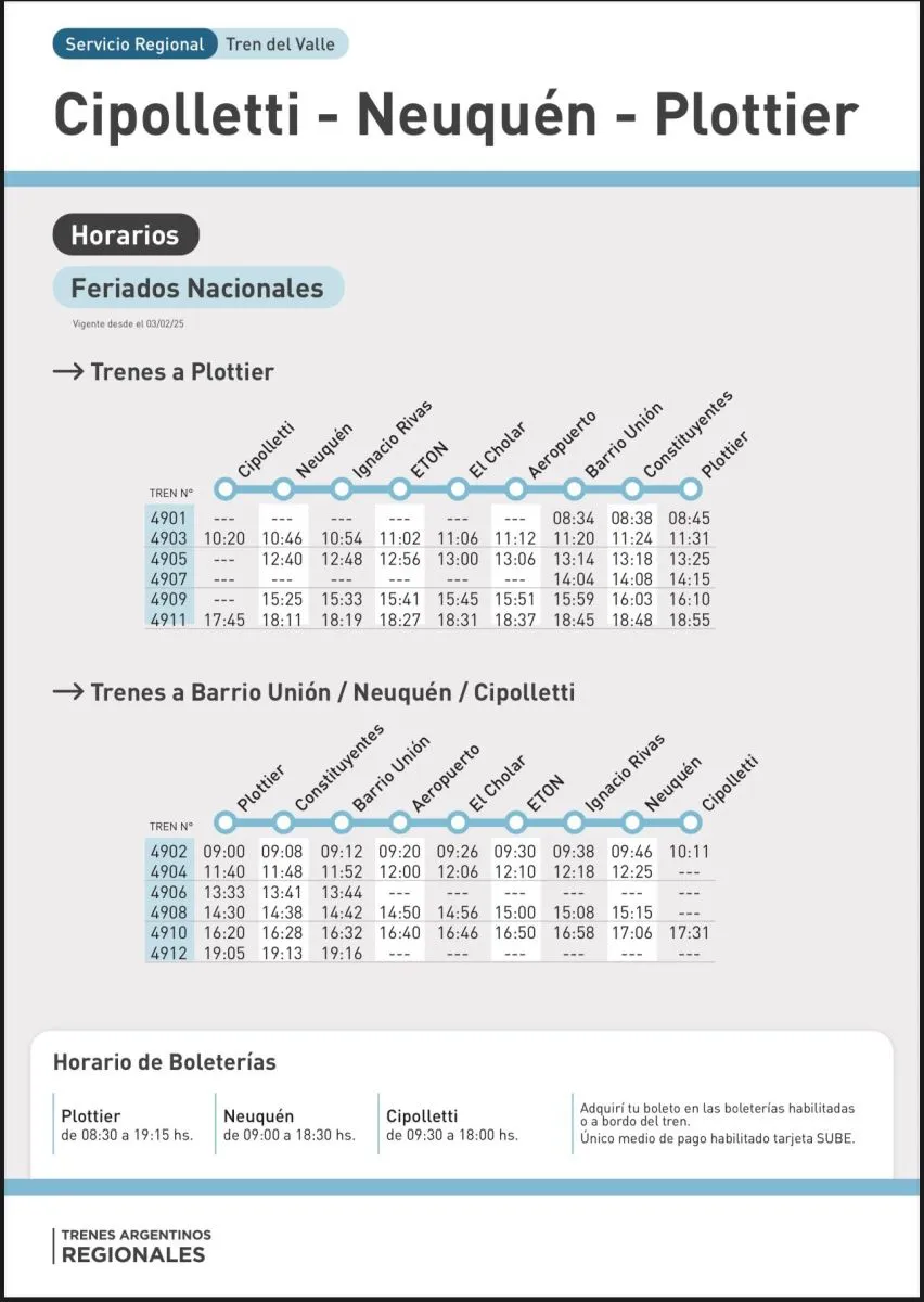Así lo informó Trenes Argentinos, que confirmó que el servicio que une las ciudades de Neuquén y Cipolletti estará disponible durante toda la jornada, aunque con menos frecuencias que en los días hábiles habituales.