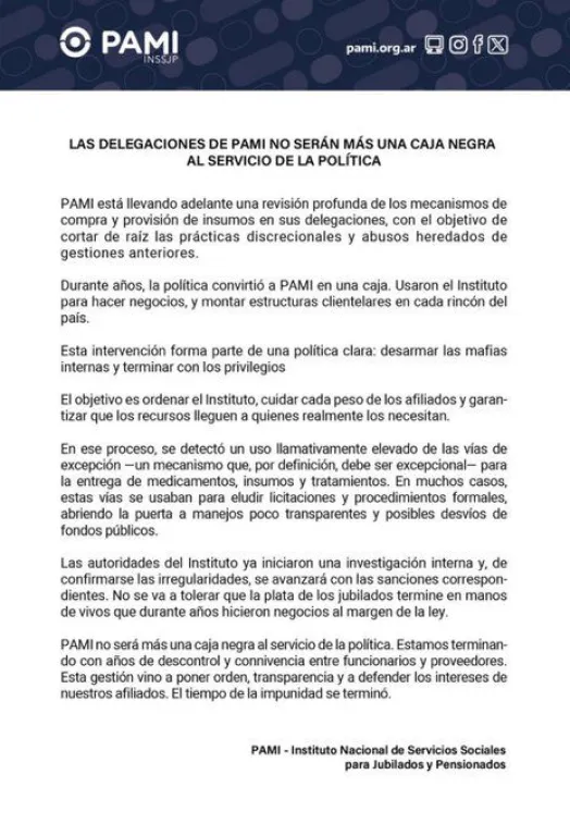 A través de un comunicado oficial, el organismo sostuvo que “durante años, la política convirtió al PAMI en una caja”, al tiempo que denunció que se montaron “estructuras clientelares en cada rincón del país para hacer negocios con recursos que deberían destinarse a los jubilados”.