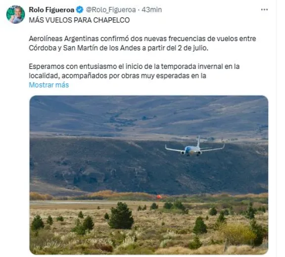 San Martín de los Andes.- Aerolíneas Argentinas confirmó que sumará dos nuevas frecuencias semanales entre Córdoba y San Martín de los Andes a partir del próximo 2 de julio. La medida busca fortalecer la conectividad aérea durante la temporada de invierno, cuando la localidad recibe un importante flujo de turistas.