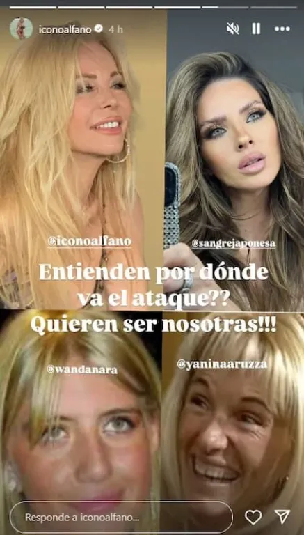 En medio de las críticas que enfrenta Eugenia "la China" Suárez por su relación con Mauro Icardi, Graciela Alfano publicó en su cuenta de Instagram una imagen que generó revuelo. La exvedette compartió una historia con cuatro fotografías: en la parte superior, una imagen de ella junto a Suárez, sugiriendo una similitud en belleza; en la inferior, postales vintage de Wanda Nara y Yanina Latorre. Acompañó la publicación con la frase: "¿Entienden por dónde va el ataque? ¡Quieren ser como nosotras!" .