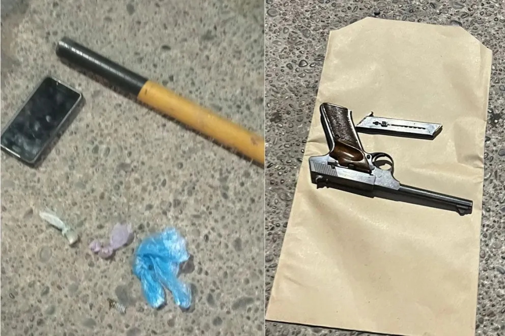 Durante el procedimiento, la policía encontró un arma de fuego con sus respectivos accesorios y tres envoltorios con sustancia vegetal de color verde, que fueron remitidos al área de Toxicomanías. El test orientativo confirmó que se trataba de sustancias ilegales.