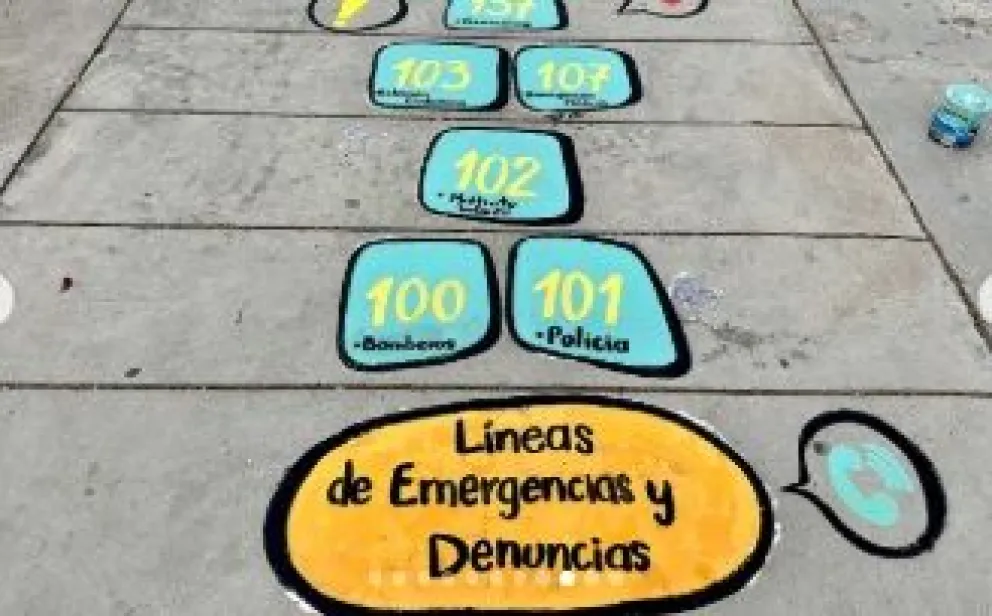 Uno de los ejes centrales del proyecto es la instalación de una nueva rayuela pintada en el suelo, que además de invitar a saltar y divertirse, incorpora datos clave de líneas de emergencia y denuncia.