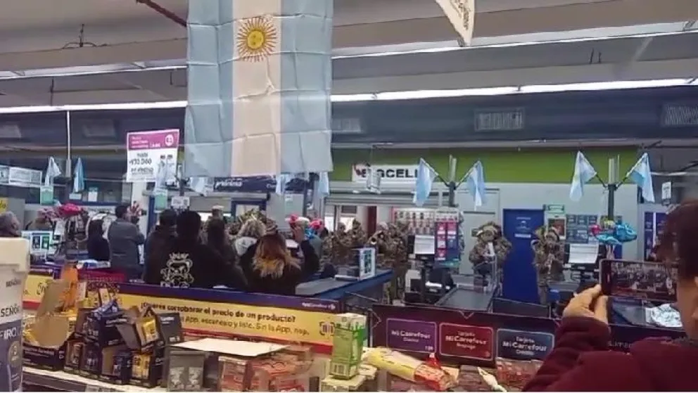 En el marco de los actos por el 25 de Mayo, integrantes del Ejército Argentino irrumpieron entre las góndolas con sus instrumentos para interpretar las estrofas del Himno Nacional.