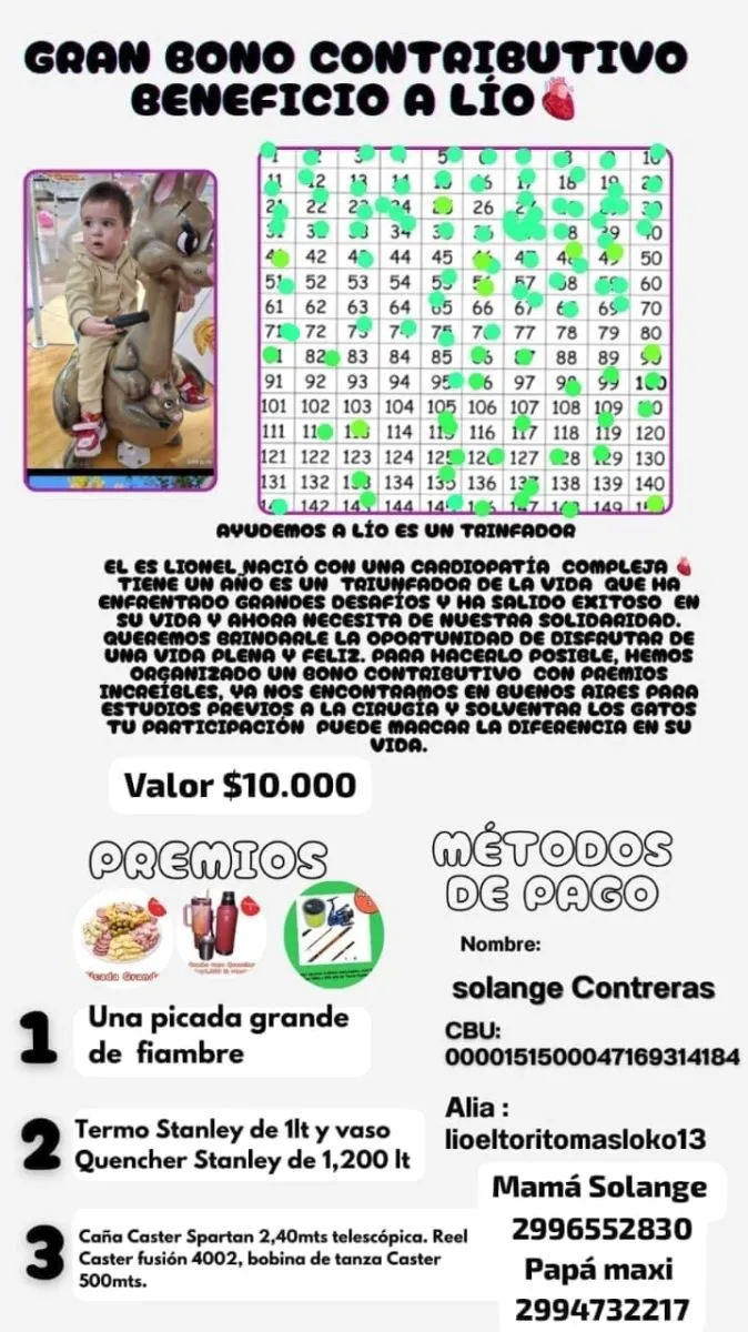 Maximiliano Emmanuel Videla, el papá de Lionel, explicó que junto a su esposa organizaron una rifa como bono contribución para poder solventar los gastos de comida, traslados y estadía. El objetivo es poder mantenerse en la ciudad durante el tratamiento y luego regresar a Neuquén.