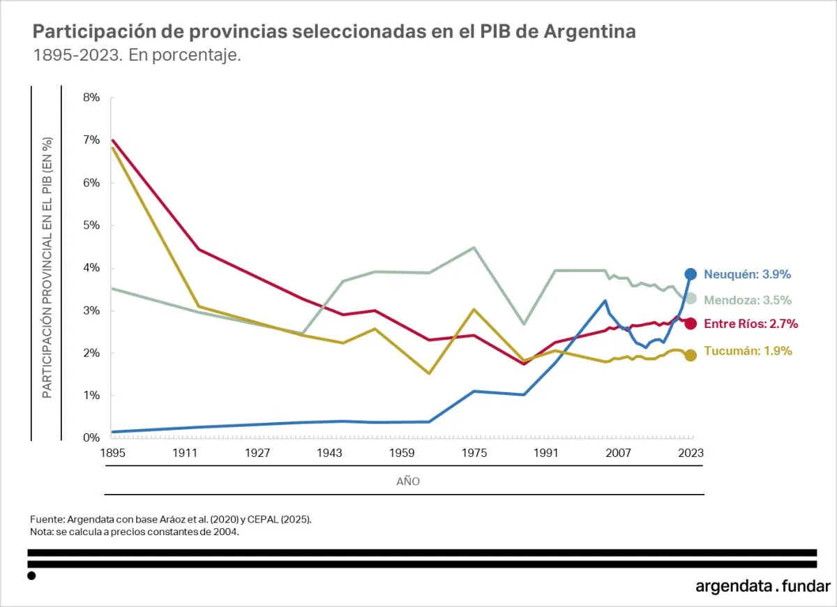 “Entre Ríos y Tucumán alguna vez explicaron el 7% del PBI argentino. Hoy no llegan al 3%”, afirmó. En contraposición, Neuquén —impulsada en gran parte por el desarrollo de Vaca Muerta y el complejo energético e hidrocarburífero— ha experimentado un crecimiento sostenido. “Hace un siglo no llegaba ni al 1%. Ahora ya roza el 4%”, indicó.