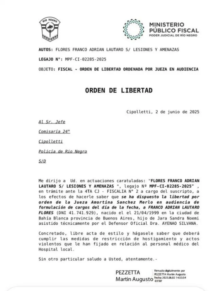 Aunque fue detenido, por disposición de la Justicia Flores recuperó la libertad en pocas horas. La decisión generó malestar entre autoridades provinciales y trabajadores de la salud.