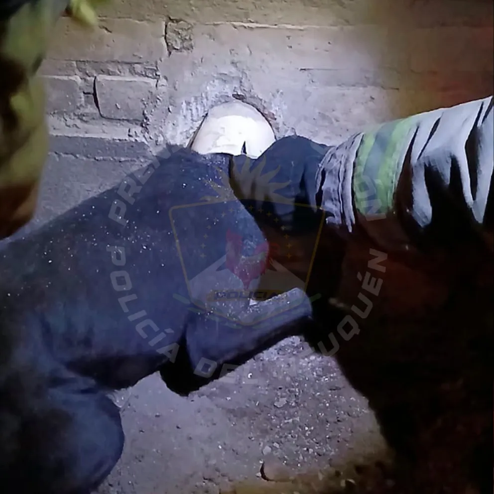 Ocurrió este martes por la noche en una vivienda de calle Río Negro. Bomberos utilizaron herramientas manuales para liberar al animal, que estaba atorado en un desagüe pluvial.