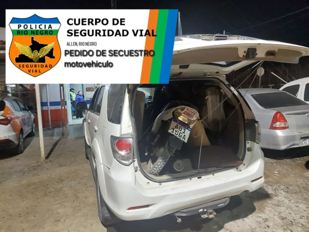 Durante un operativo de control vehicular realizado el lunes por la noche en el kilómetro 1198 de la Ruta Nacional 22, personal del Cuerpo de Seguridad Vial de Allen recuperó una motocicleta que tenía pedido de secuestro activo por robo.