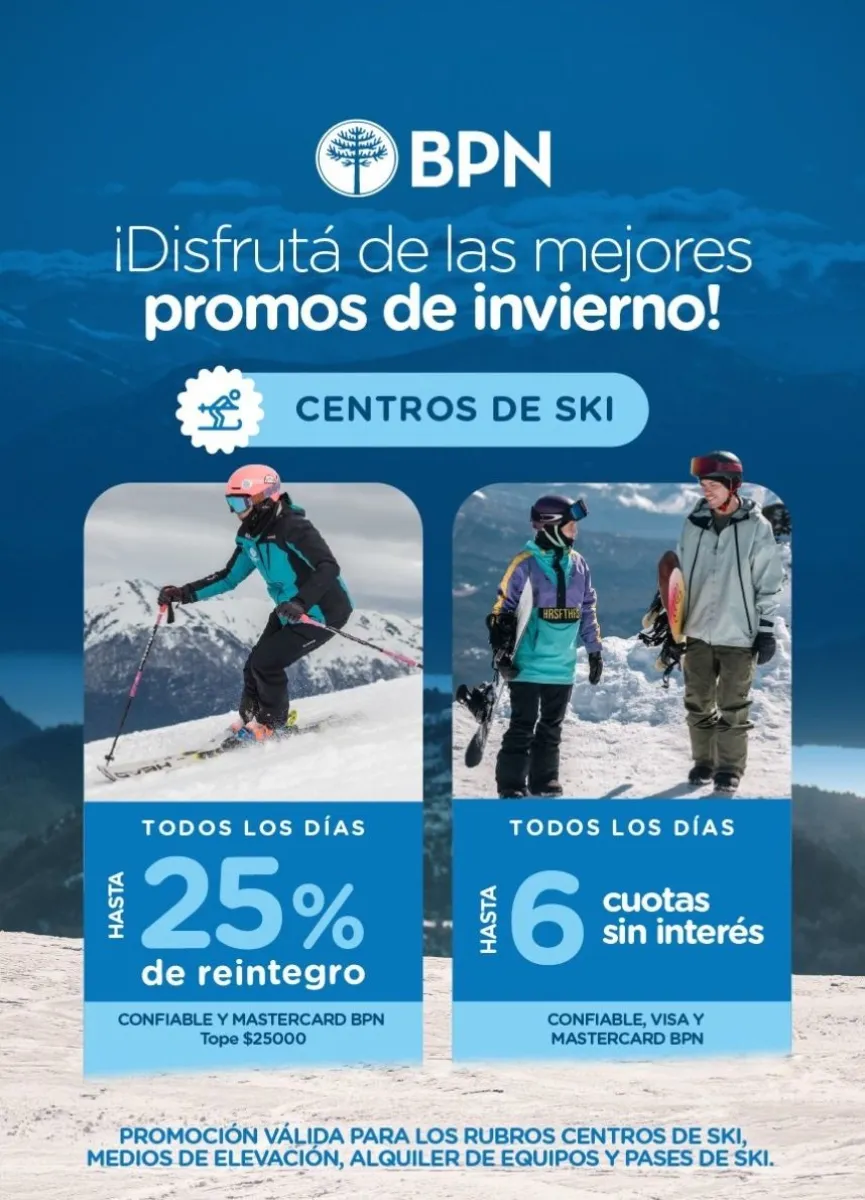 El Banco Provincia del Neuquén (BPN) lanzó una serie de promociones para disfrutar la temporada de invierno en los centros de ski de la Patagonia, con beneficios exclusivos para sus clientes que utilicen tarjetas de crédito Visa, Mastercard y Confiable.
