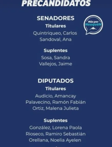 La lista a senadores está encabezada por Quintriqueo y acompaña Ana Sandoval, escribana y abogada con experiencia en la administración pública provincial. Completan la lista Sandra Sosa y Jaime Vallejos.