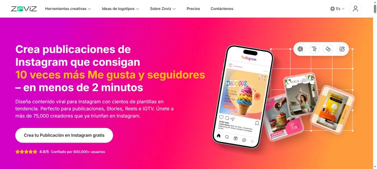 Diseño de publicaciones de Instagram con Zoviz: Esta herramienta se ha convertido en una de las más populares de los últimos años por su simplicidad y efectividad. Su entorno es intuitivo y fácil de usar para cualquier persona. Ofrece una amplia variedad de plantillas que abarcan desde publicidad hasta la presentación de productos. La posibilidad de personalizar colores y tipografías sin complicaciones es uno de los aspectos más valorados por los usuarios. Además, su buena velocidad de carga y la vista previa en tiempo real hacen que la experiencia sea fluida y agradable.