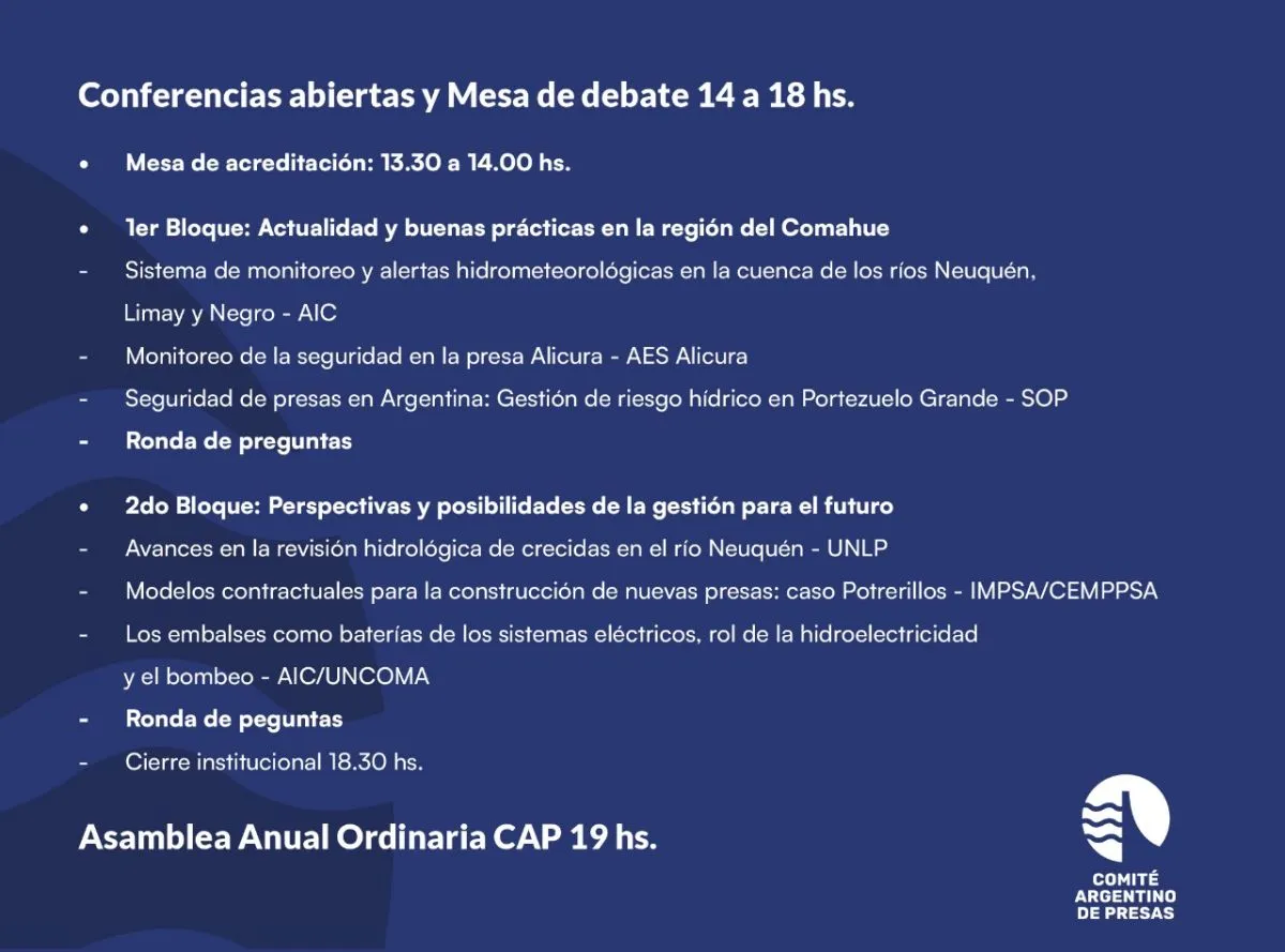 El Comité Argentino de Presas (CAP) convocó a una jornada sobre seguridad de presas, que se desarrollará el lunes próximo entre las 13.30 y las 18.30.