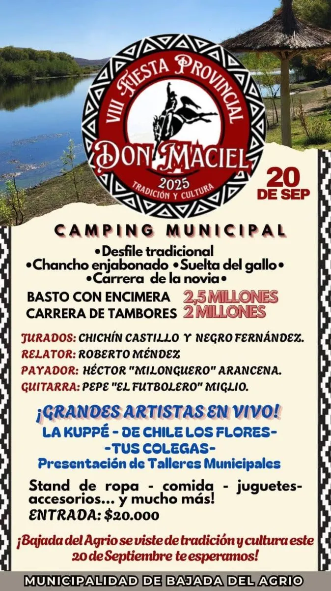 En diálogo con FM Calden de Las Lajas, el intendente de Bajada del Agrio, Ricardo Esparza, brindó detalles sobre la 8° edición de la Fiesta Provincial de Don Maciel, que este año se comienza este sábado 20 de septiembre en el camping municipal.