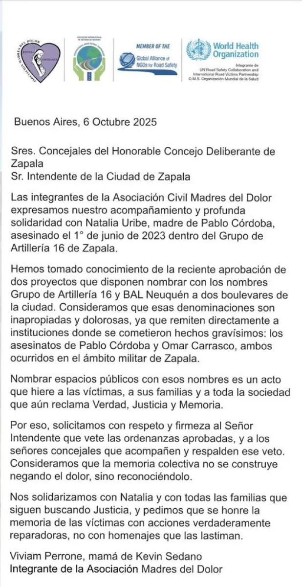 Madres del Dolor piden vetar ordenanzas que nombran boulevares como Grupo de Artillería 16 y BAL de Zapala
