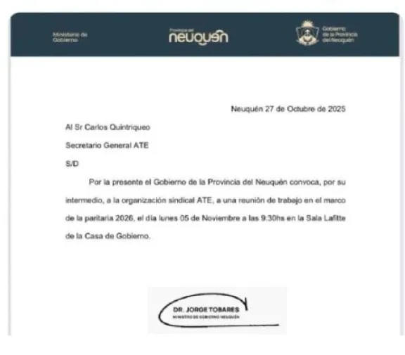 La notificación, firmada por el ministro de Gobierno, Jorge Tobares, fue enviada este lunes 27 de octubre al secretario general de ATE Neuquén, Carlos Quintriqueo, y establece que el encuentro se llevará a cabo el miércoles 5 de noviembre a las 9:30 horas en la Sala Laffitte de la Casa de Gobierno.