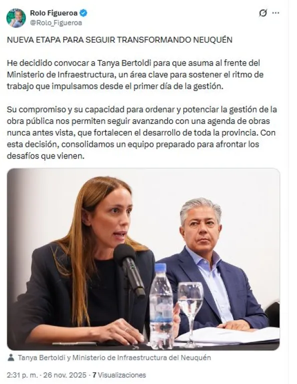 La diputada nacional Tanya Bertoldi asumirá como ministra de Infraestructura de Neuquén. El cargo permanecía vacante desde enero y la funcionaria renunciará a su banca en el Congreso días antes de finalizar su mandato.