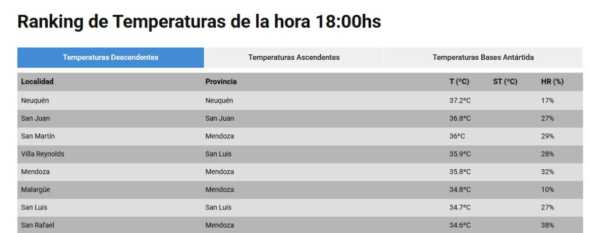 La combinación de altas temperaturas y baja humedad, que rondó el 17%, intensificó la sensación de agobio durante toda la jornada. El termómetro marcó valores extremos en gran parte del territorio argentino, pero fue Neuquén la que se ubicó en lo más alto del listado, reflejando una tarde especialmente pesada para vecinos y vecinas.