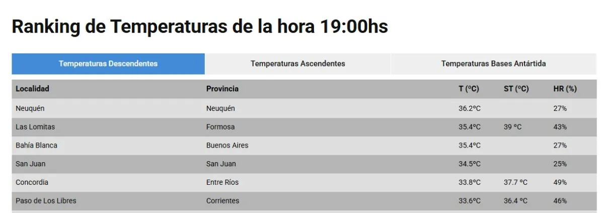 El listado nacional mostró además a Las Lomitas (Formosa) y Bahía Blanca (Buenos Aires) muy cerca, con 35,4 °C, mientras que San Juan, Concordia y Paso de los Libres completaron el top de localidades con temperaturas extremas.
