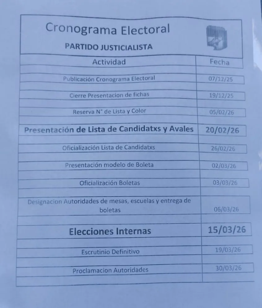 En ese marco, el proceso electoral ya tiene fechas definidas. Según el cronograma interno, la presentación de listas de candidatos y avales será el 20 de febrero, mientras que la oficialización de listas está prevista para el 26 de febrero. Luego, el 2 de marzo se deberán presentar los modelos de boleta y el 3 de marzo se oficializarán las boletas que competirán en la elección.