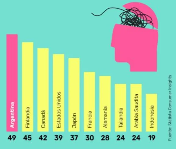 Un reciente estudio de la plataforma Statista reveló que Argentina encabeza el ranking mundial de estrés diario, con el 49% de su población reportando sentirse estresada con frecuencia.