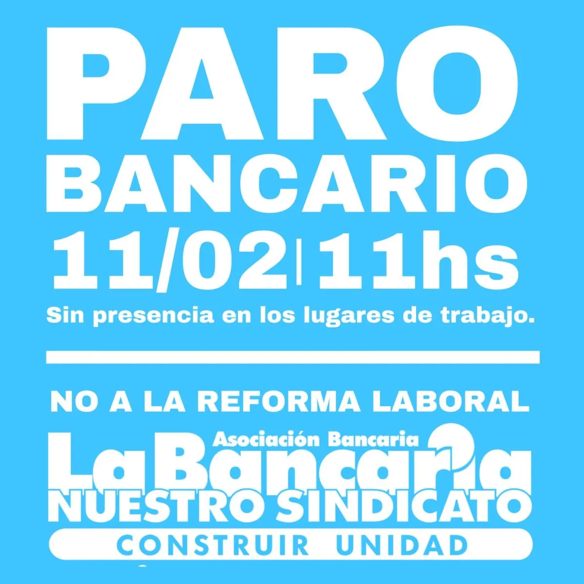 Neuquén.- El sindicato La Bancaria anunció un paro total de actividades en Neuquén este miércoles 11 de febrero, a partir de las 11 de la mañana, sin asistencia a los lugares de trabajo. La medida se enmarca en la movilización nacional contra la reforma laboral impulsada por el Gobierno.