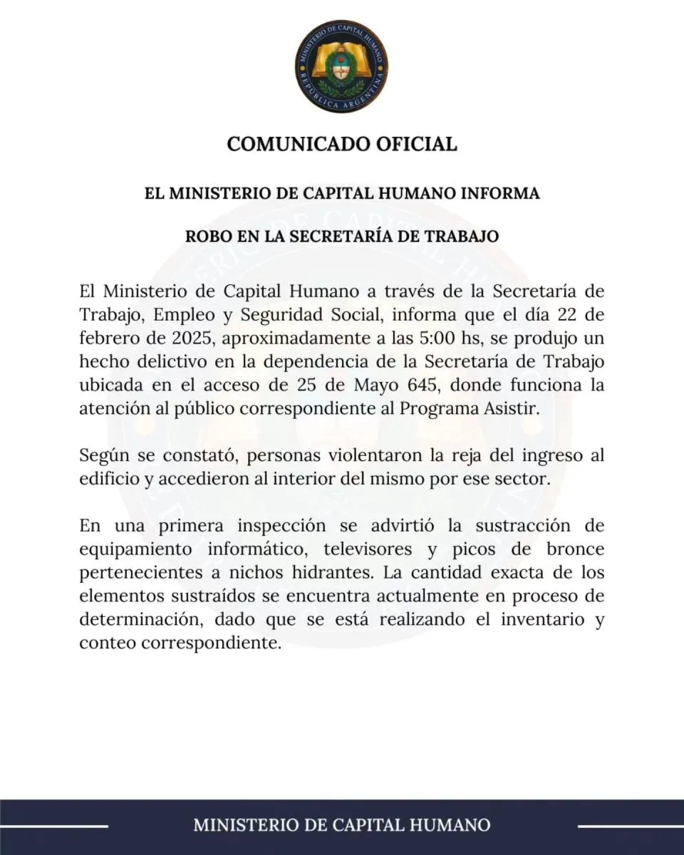 El Ministerio de Capital Humano, a través de la Secretaría de Trabajo, Empleo y Seguridad Social, informó que el 22 de febrero de 2025, aproximadamente a las 5:00, se produjo un hecho delictivo en la dependencia de la Secretaría de Trabajo ubicada en el acceso de 25 de Mayo 645, donde funciona la atención al público correspondiente al Programa Asistir.
