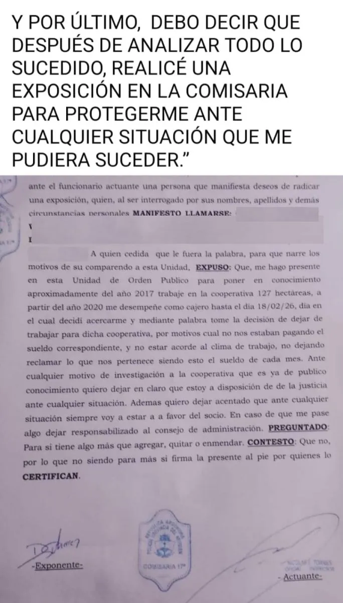 "Y por último, debo decir que después de analizar todo lo sucedido, realicé una exposición en la comisaría para protegerme ante cualquier situación que me pudiera suceder", señaló en la denuncia.