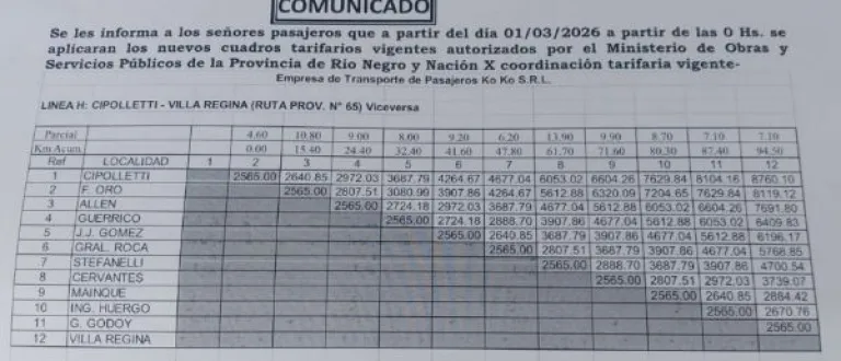 A partir del 1° de marzo de 2026, el pasaje del transporte interurbano Transporte Koko registrará un nuevo incremento en los servicios que unen Cipolletti con Villa Regina, según informó la empresa a través de un comunicado oficial.