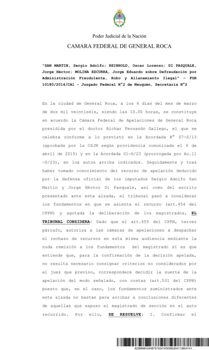 La Cámara Federal de Apelaciones de General Roca confirmó el procesamiento por delitos de lesa humanidad contra tres militares acusados de haber participado en la apropiación de 23 departamentos pertenecientes a periodistas en la Torre de Periodistas.