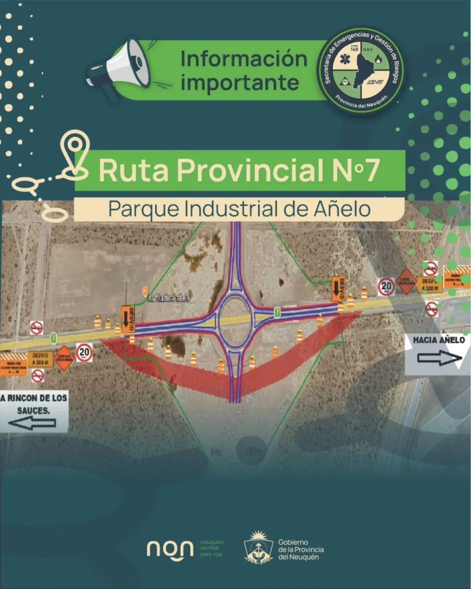 La Secretaría de Emergencias y Gestión de Riesgos de Neuquén informó que a partir del lunes 16 de marzo se implementará un desvío de tránsito en la intersección de la Ruta Provincial 7 y la Circunvalación, en el sector del Parque Industrial de Añelo.