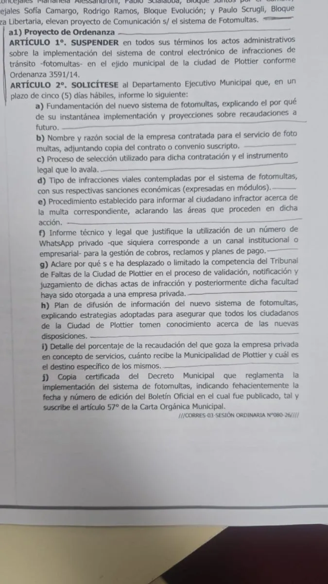 Concejales de distintos bloques del Concejo Deliberante de Plottier presentaron un proyecto de ordenanza que propone suspender en todos sus términos los actos administrativos vinculados a la implementación del sistema de control electrónico de infracciones de tránsito, conocido como fotomultas, en el ejido municipal de la ciudad.