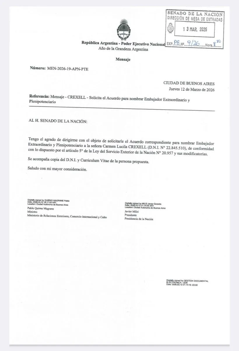 El Poder Ejecutivo Nacional solicitó formalmente al Senado de la Nación Argentina el acuerdo correspondiente para designar a Carmen Lucila Crexell como embajadora extraordinaria y plenipotenciaria de la República Argentina.