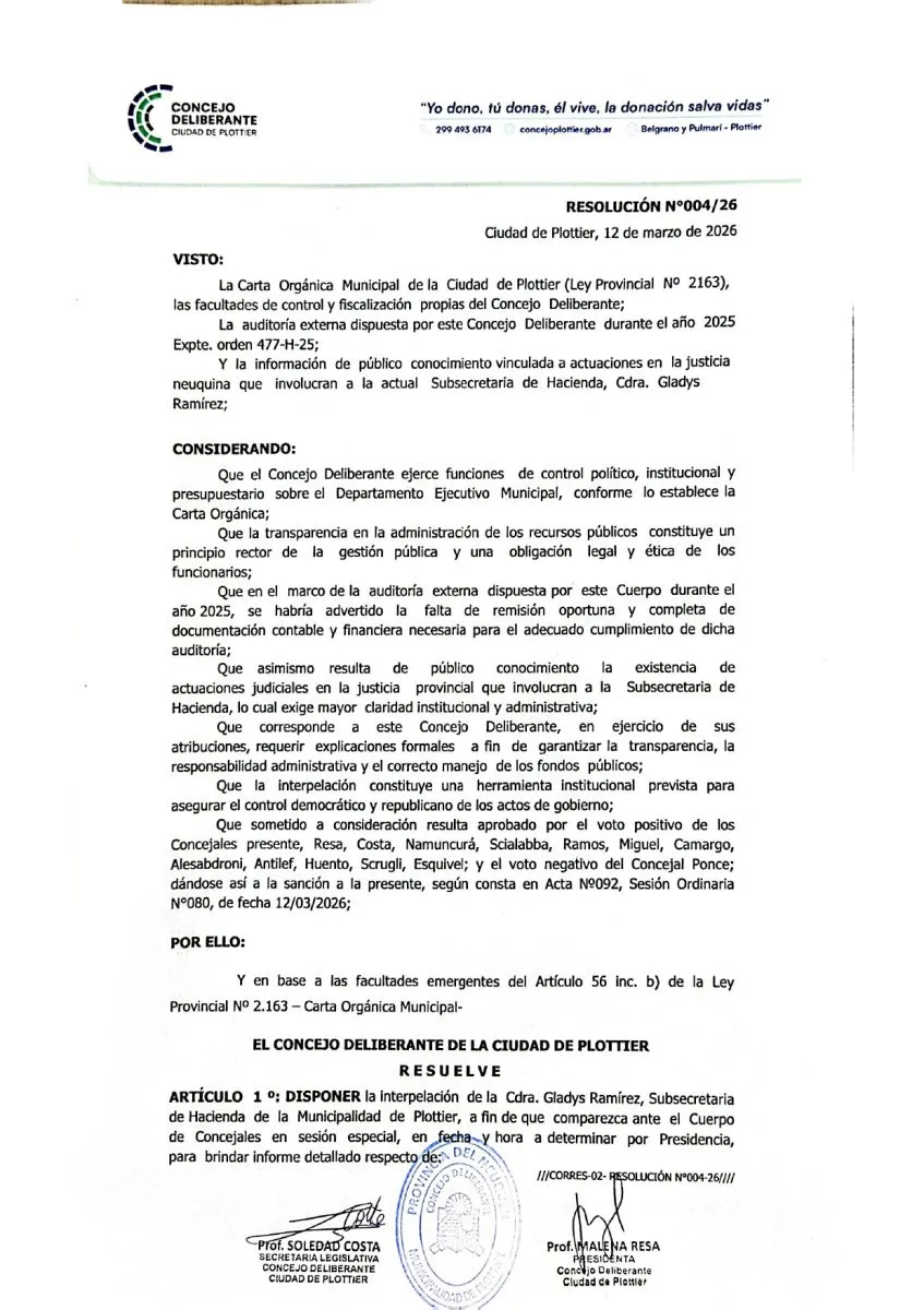 El Concejo Deliberante de Plottier convocó a una sesión especial para el próximo 27 de marzo a las 18, en la que se llevará adelante la interpelación a la secretaria de Hacienda del municipio, contadora Gladis Ramirez.